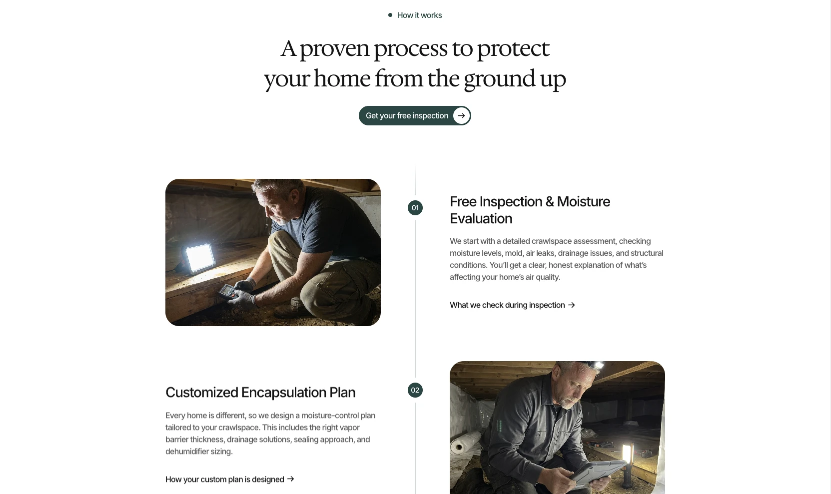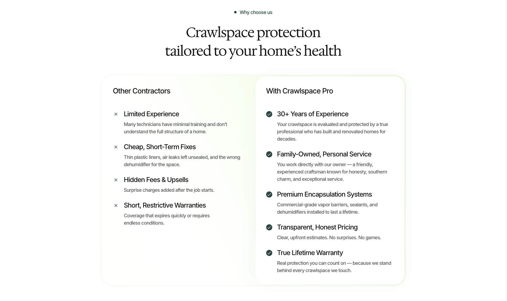 Crawlspace Pro is a family-owned crawlspace and home-air quality company that had no online presence despite a strong local reputation and a loyal customer base. They came to me looking to establish a professional website and build SEO visibility within their service area. I designed and developed a clean, minimal, and highly organized website that visually communicated the core idea behind their work: clean, healthy air. The brand direction uses a green-forward palette, soft spacing, and a simple layout that feels fresh and trustworthy. I also structured the site for strong local SEO so they could begin attracting leads online and expanding beyond word-of-mouth referrals.