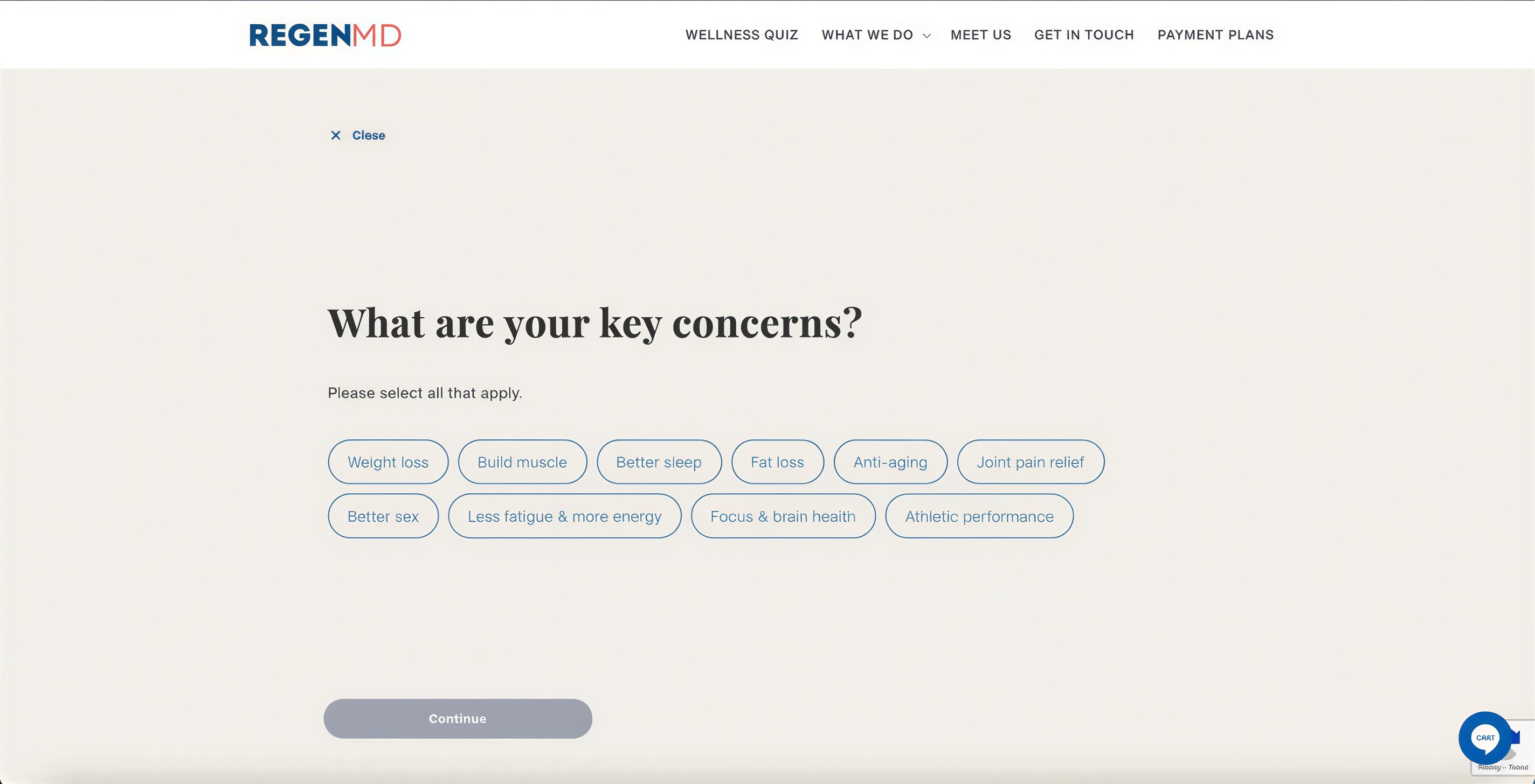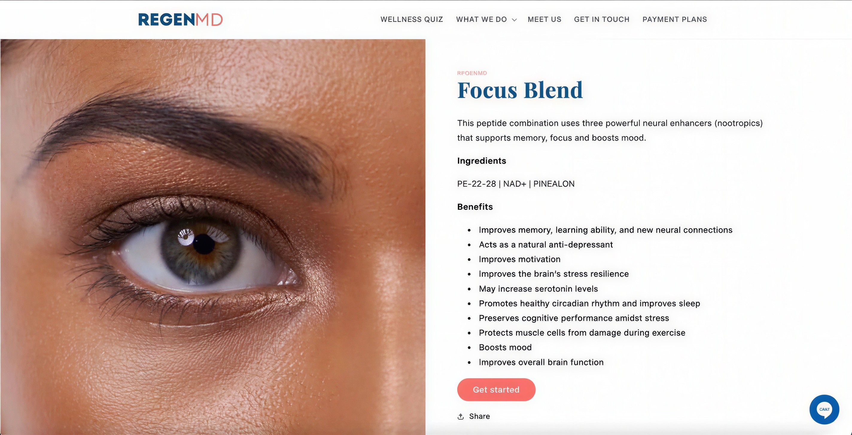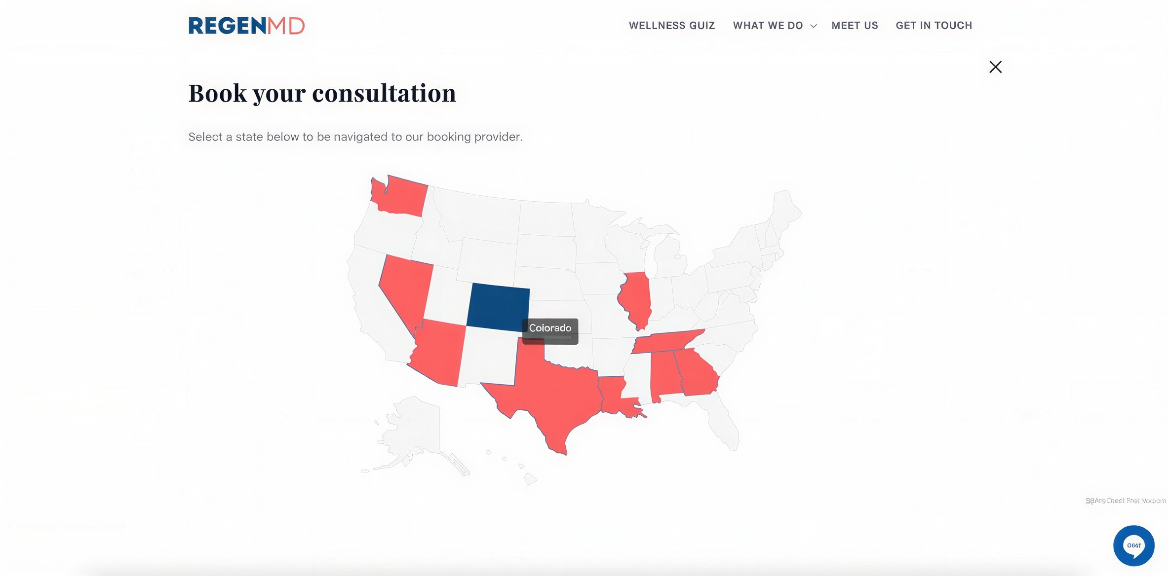 RegenMD is a telehealth peptide service delivering prescriptions and supplies directly to customers through a subscription model. They had no online presence and needed a modern, easy-to-digest website that made a complex medical offering feel simple, playful, and approachable. I built their site on Shopify so their team could easily update content, and developed a fully custom React peptide finder quiz that can be configured directly in the Shopify theme editor. Because peptide prescriptions are only legal in certain states, I also created an interactive eligibility map that guides users to the correct telehealth scheduling flow based on where they live. The result is a clean, engaging experience that helps customers understand their options and book appointments with confidence.